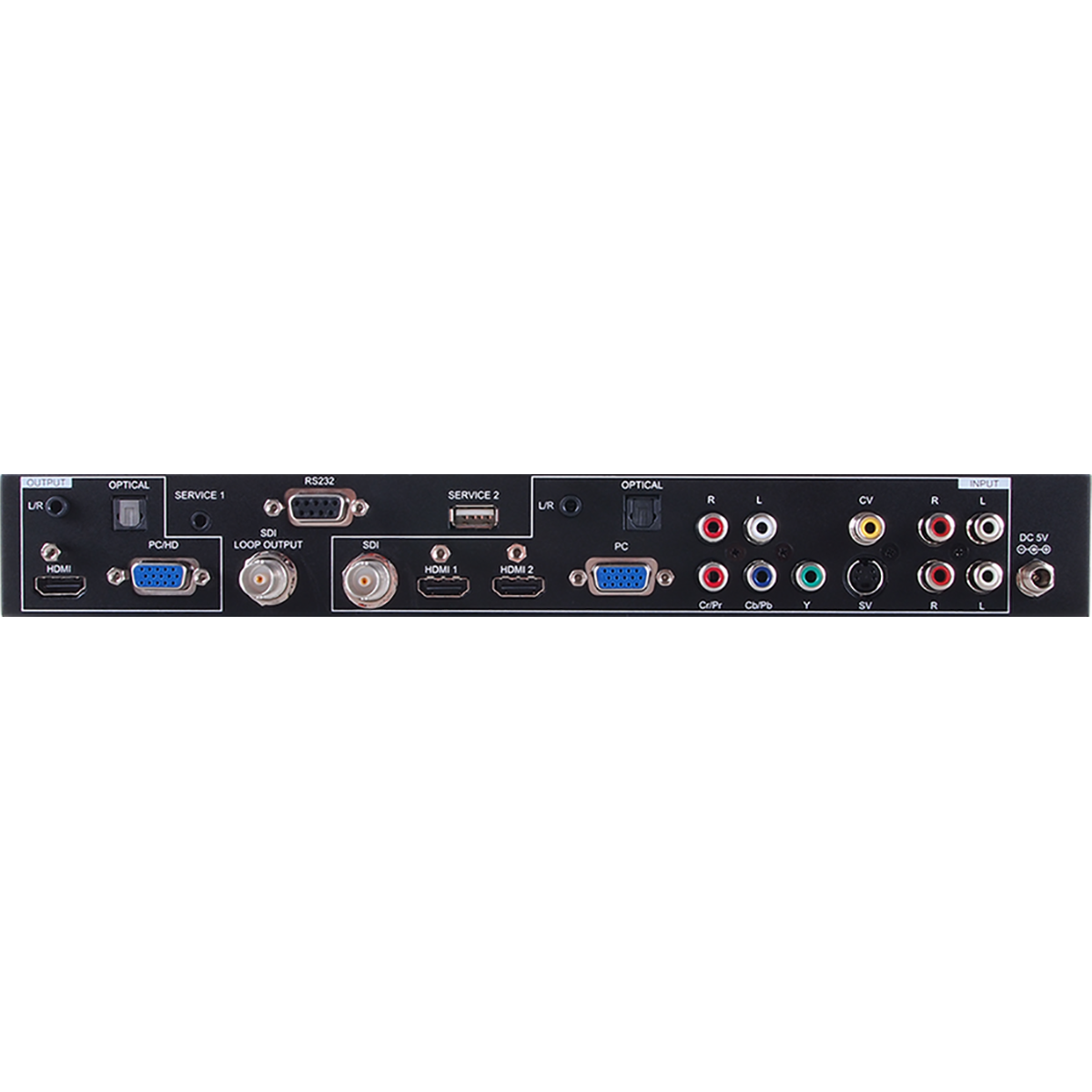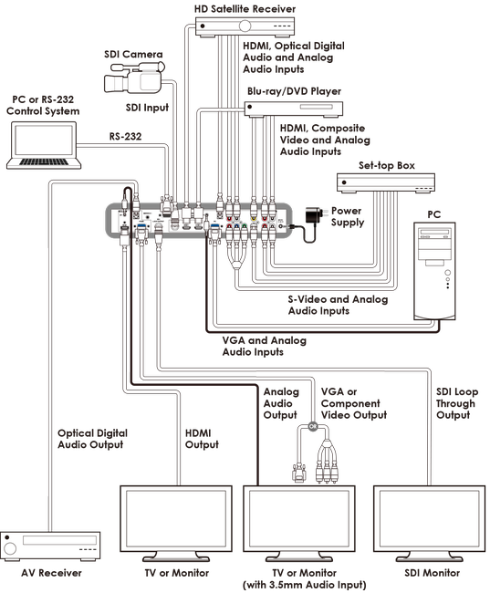 Ten konwerter wielu formatów na HDMI to zaawansowane HDMI, PC, SDI, Kompozytowy, S-Video i Adapter przełącznika/mieszacza. To urządzenie może skalować i przełączać źródła sygnału wejściowego oraz jednocześnie wyświetlać je na wyjściach HDMI i VGA/HD, wraz z ich powiązanymi sygnałami audio, w szerokim zakresie rozdzielczości wyjściowych (do 1080p lub WUXGA(RB)). Posiada także dodatkową zaletę w postaci pętli SDI Loop Out służącej do monitorowania lub przedłużania sygnału wejściowego SDI. Sterowanie odbywa się za pośrednictwem pilota IR, RS-232 lub za pomocą przycisków Panelu przedniego i obejmuje menu na ekranie zapewniające ustawienia oraz informacje o systemie.