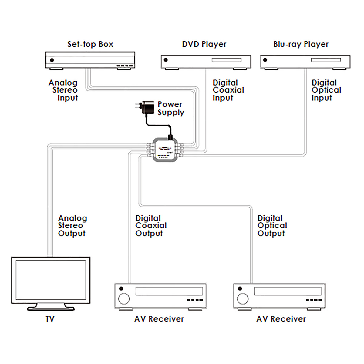 Uniwersalny Analogowy konwerter audio cyfrowo/analogowy z dekoderem Dolby® Digital & DTS® 2.0+Digital Out może konwertować między sygnałami optycznymi, koncentrycznymi oraz analogowymi. Z możliwością konwersji sygnałów cyfrowych na analogowe i sygnałów analogowych na cyfrowe, to urządzenie obsługuje jednoczesną konwersję formatów audio, więc podczas konwertowania audio Optycznego na analogowe możesz również przekształcić je na Koaksjalne. Dlatego, jeśli ograniczają Cię różne formaty dźwięku, Uniwersalny Analogowy konwerter audio cyfrowo/analogowy z dekoderem Dolby Digital & DTS 2.0+Digital Out jest doskonałym wyborem.