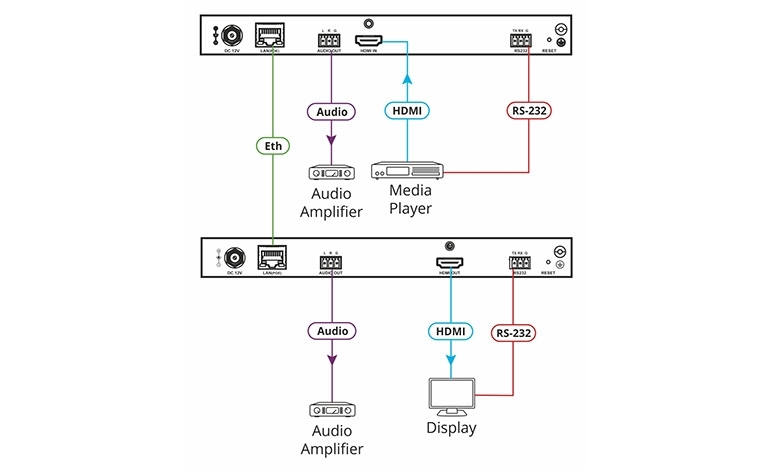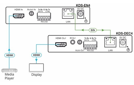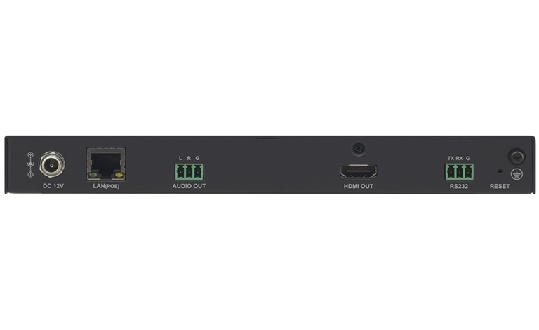 KDS-DEC5 to dekoder i odbiornik strumienia H.264, MPEG-4 przesyłanego przez Ethernet 10/100/1000BaseT z PoE dla sygnałów o rozdzielczości do UHD 4K60 (4:2:0) z HDCP 2.2. Odbiera strumienie wideo i audio, sygnały sterowania RS-232 z enkodera KDS-EN5, a następnie dostarcza sygnały do wyjścia HDMI, wyjścia audio stereo i portu RS-232 odpowiednio.