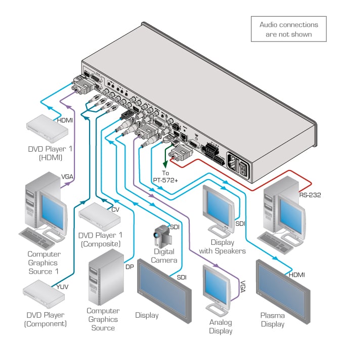 Uwaga: Zasięg transmisji zależy od rozdzielczości sygnału, karty graficznej i używanego wyświetlacza. Jeśli używane są osłonięte kable CAT innych firm, oba końce ekranu muszą być przylutowane do konektorów, aby produkty działały poprawnie. - Wejścia wideo — Komponentowe (Y, Pb, Pr) wideo na konektorach RCA, DisplayPort (DP), SD/HD/3G HD–SDI (w tym pętla SDI) na złączach BNC, 2 grafiki komputerowe na 15–pinowych konektorach HD, 2 wideo kompozytowe na konektorach RCA oraz 2 HDMI.