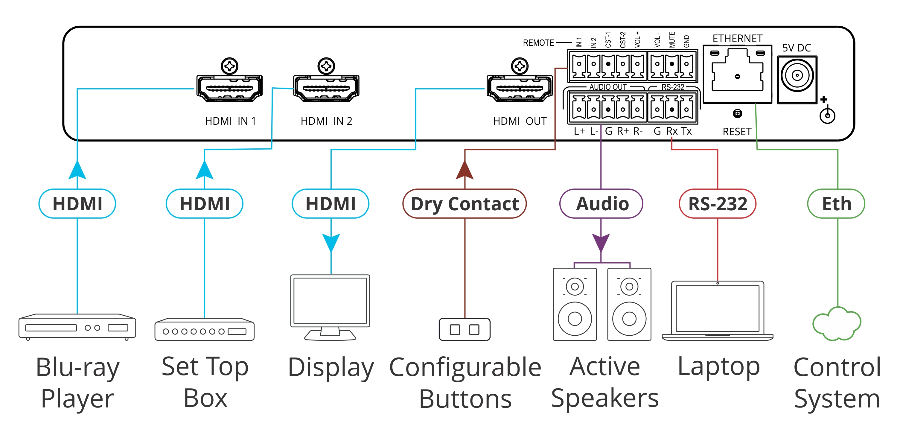 - Audio De–embedding — Cyfrowy sygnał audio przekazywany do wyjścia HDMI jest oddzielany, konwertowany na sygnał analogowy i wysyłany do niezbalansowanego analogowego wyjścia audio stereo. Umożliwia to odtwarzanie audio na lokalnie podłączonym profesjonalnym systemie audio (takim jak DSP) oraz głośnikach, równolegle do odtwarzania na głośnikach podłączonych do urządzenia akceptującego AV (jak telewizory z głośnikami).