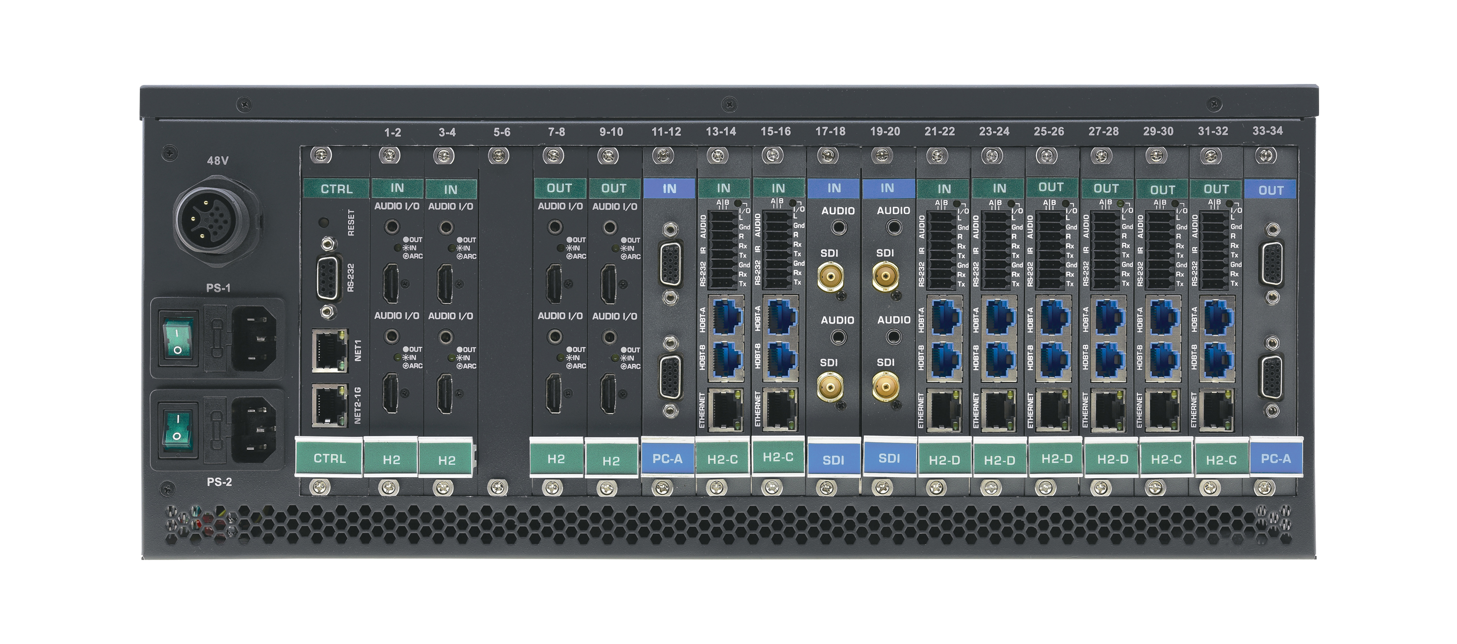 - Modularna i łatwa w konfiguracji platforma — Typy modułów wejściowych i wyjściowych można mieszać i dodawać co 2, tworząc matrycę 2 x 32, 32 x 2 lub dowolną konfigurację pośrednią. Wybierz spośród pełnej gamy popularnych i starszych formatów, aby zapełnić szasę. Ta matryca jest kompatybilna z niektórymi istniejącymi modułowymi modułami matrycy.