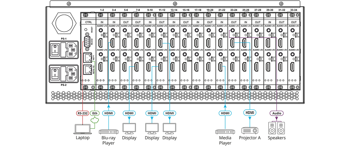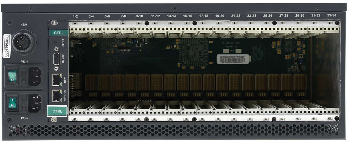 VS-34FD to wysokowydajna matryca przełączająca o 34 portach, gotowa na 8K, wieloformatowa, modułowa matryca przełączająca dla sygnałów AV, w tym HDMI™, HDBaseT, światłowodów, VGA, SDI, oraz analogowych i cyfrowych sygnałów audio. Modułowa obudowa posiada 17 gniazd do instalacji pełnego zakresu modułów wejściowych/wyjściowych i może być konfigurowana jako 2x32, 32x2 lub dowolna inna konfiguracja pomiędzy w przyrostach po dwa wejścia lub dwa wyjścia. Obudowa obejmuje moduł sterowania oraz dodatkowe redundantne zasilanie do opcjonalnego montażu.