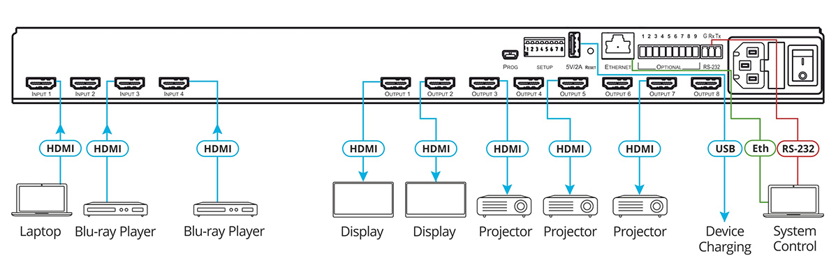 - Wygodne opcje sterowania i konfiguracji urządzenia - Lokalna kontrola poprzez przełączanie panelu przedniego, pamięć, blokadę i przyciski EDID oraz wyświetlacz diód LED wejścia/wyjścia. Sterowanie na odległość poprzez przyjazne dla użytkownika strony webowe wbudowane w Ethernet, API protokołu 3000, oraz polecenia szeregowe RS-232 nadawane przez PC, system z ekranem dotykowym lub inne urządzenie sterujące szeregowe.