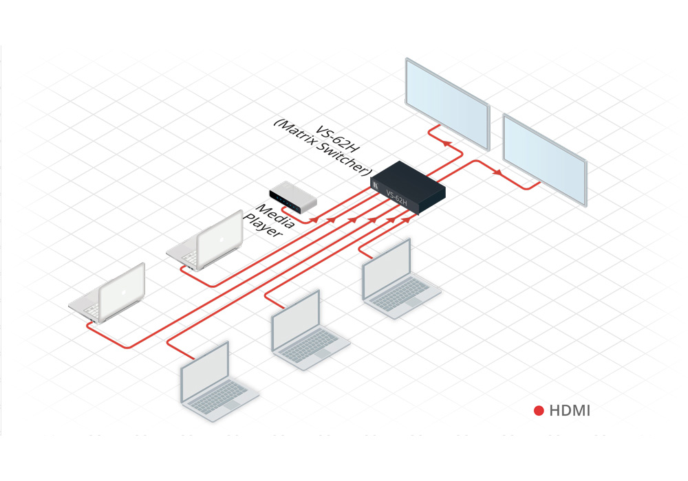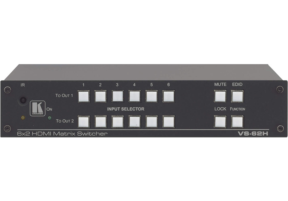 VS-62H to wysokiej jakości przełącznik matrycowy 6x2 dla sygnałów HDMI 4K@60Hz (4:2:0). Regeneruje i wyrównuje sygnały oraz może kierować dowolne wejście na jedno lub oba wyjścia jednocześnie. Obsługuje rozdzielczości do 4K@60Hz (4:2:0) oraz WUXGA.