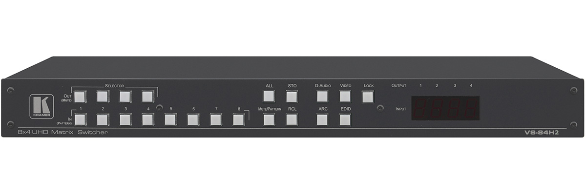 VS-84H2 jest wysokiej wydajności Przełącznik matrycowy 8x4 dla sygnałów 4K@60Hz (4:4:4) HDR i kierowania cyfrowym audio. Regeneruje i wyrównuje sygnały oraz może kierować dowolne z 8 źródeł HDMI, zgodnych z HDCP (do wyboru), do dowolnego lub wszystkich wyjść jednocześnie. VS-84H2 oferuje nieporównywalną elastyczność audio, gdzie dowolne wbudowane cyfrowe wejście audio może być kierowane do dowolnego cyfrowego wyjścia, oprócz czterech źródeł ARC, co daje równoważność 12x12 Matryca audio.