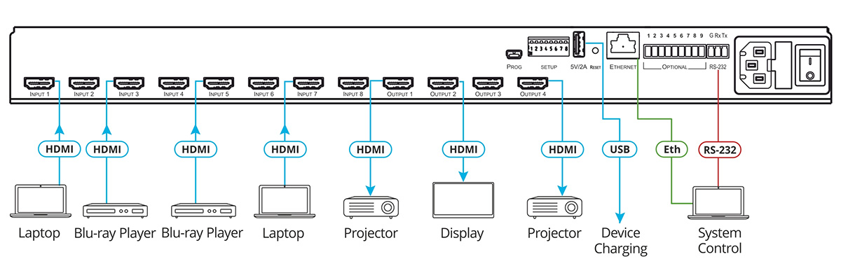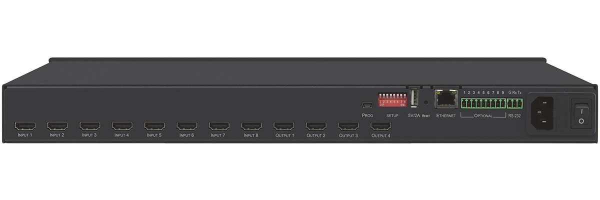 - Pożądane opcje sterowania urządzeniem i konfiguracji - Lokalne sterowanie poprzez przełączanie na Panelu przednim, pamięć, blokadę i przyciski EDID, oraz wyświetlacz LED wejścia/wyjścia. Sterowanie na odległość poprzez przyjazne dla użytkownika strony webowe wbudowane w Ethernet, API protokołu 3000, oraz polecenia szeregowe RS-232 nadawane przez PC, system z ekranem dotykowym lub inne urządzenie sterujące szeregowe.