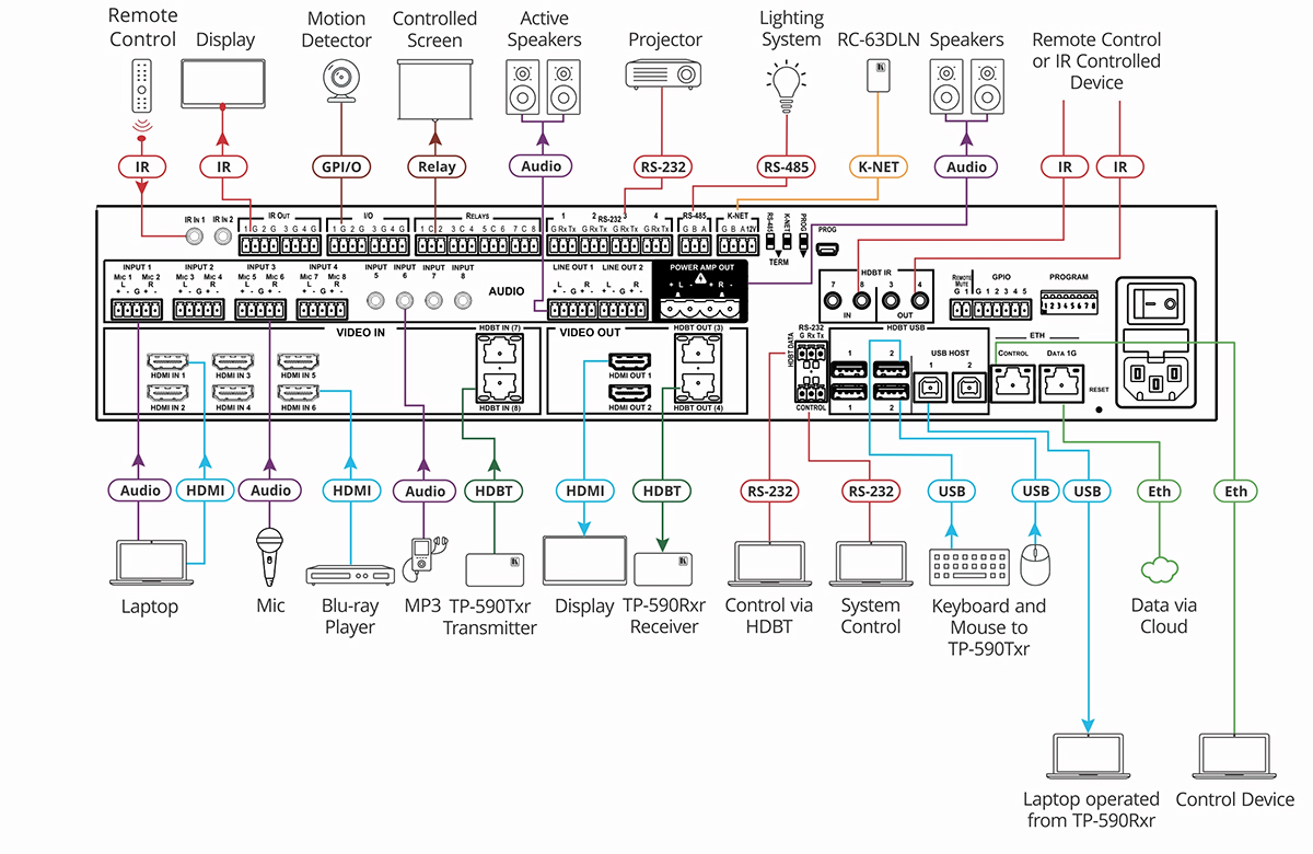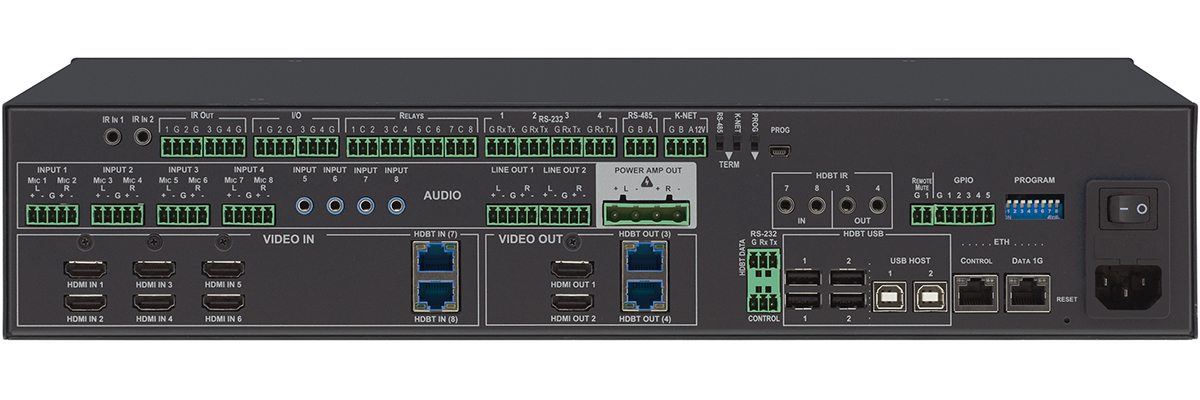 - Różnorodne i liczne formaty portów kontrolnych — Zawiera USB 1.1 i USB 2.0 (do 127Mbps) przez 2 porty typu USB-A i 2 porty typu USB-B, 6 portów IR, 1 port Ethernet, 1 port Ethernet 1G do tunelowania HDBaseT, 1 konektor K–NET™; 1 port RS–485 i 2 porty sterowania dwukierunkowego RS–232, 4 porty sterowania nadajnikami IR, 4 porty kontrolne GPI/O oraz 8 portów kontrolnych przekaźnikowych.