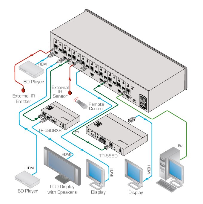 Przełącznik matrycy VS-88DT kieruje do ośmiu wejść HDMI i IR do dowolnego lub wszystkich ośmiu wyjść HDMI lub HDBaseT i IR do połączenia z kompatybilnymi odbiornikami HDBaseT, takimi jak TP-580RXR.