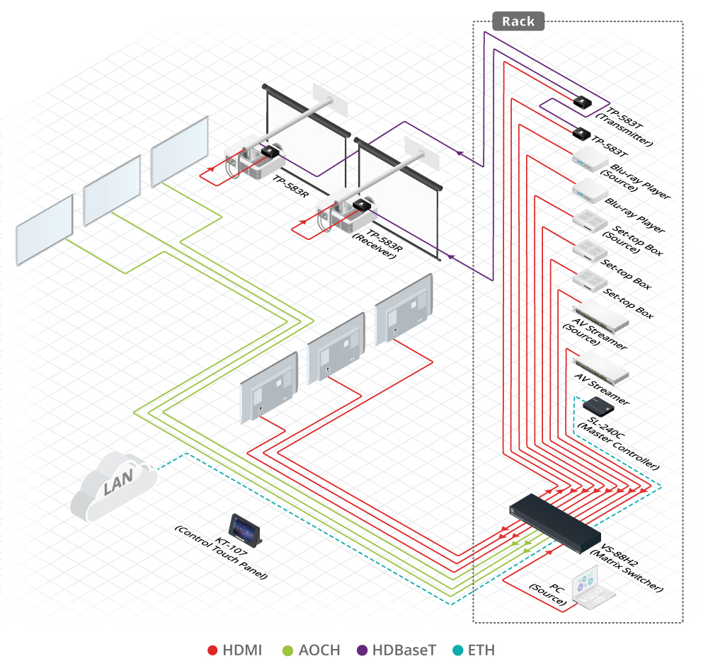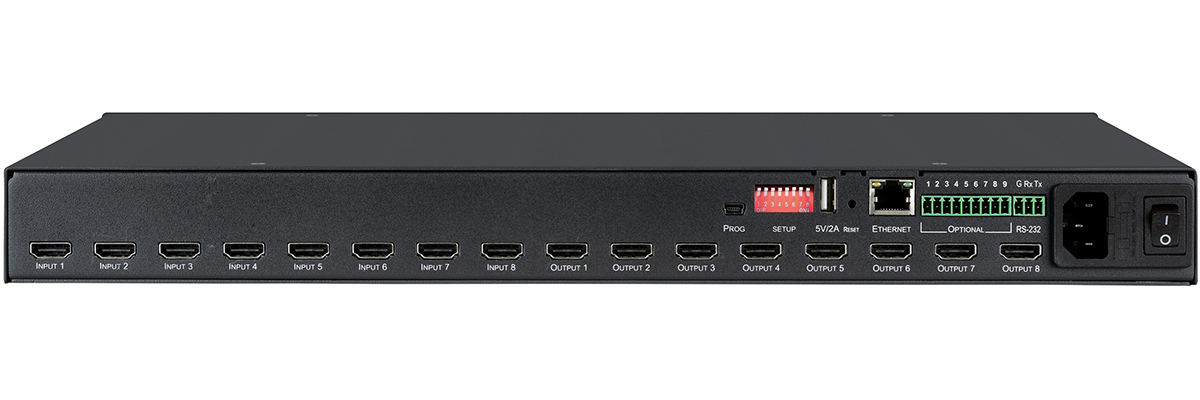 - Wygodna Kontrola Urządzenia i Opcje Konfiguracji — Lokalna kontrola za pomocą przełączania na Panel przedni, pamięci, blokady i przycisków EDID oraz wyświetlacza LED wejść/wyjść. Kontrola z odległości za pomocą łatwych w obsłudze wbudowanych stron internetowych przez Ethernet, Protokół API 3000 oraz polecenia szeregowe RS–232 przesyłane przez PC, system dotykowy lub inne urządzenie szeregowe.