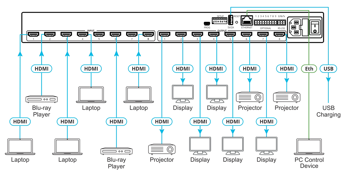 - Wysokowydajna matryca AV — Przełącza 8 sygnałów 4K@60Hz (4:4:4), HDR, HDMI, zgodnych z HDCP (2.2/1.4) na 8 wyjść 4K@60Hz (4:4:4), HDR, HDMI, zgodnych z HDCP (2.2/1.4) przy przepustowości danych do 18G. Zawiera technologię rekompensacji Kramer re–Klocking™ i równoważenia, która odbudowuje sygnał cyfrowy do przesyłu na większe odległości. Uwaga: Dla optymalnego zasięgu i wydajności używaj zalecanych kabli Kramer.