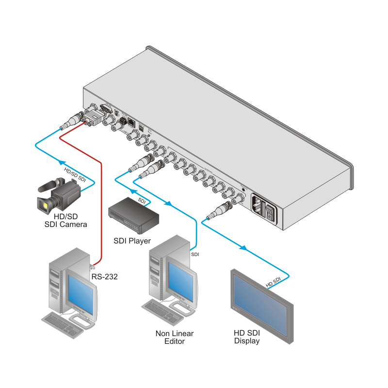 Urządzenie może przełączać dowolne wejścia na dowolne wyjścia. Przełączanie jest realizowane w okresie pionowego odstępu zgodnie z normą SMPTE RP−168, podczas użycia zsynchronizowanych cyfrowych źródeł wideo.
