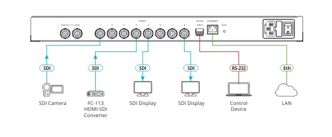 VS−8UFX to ośmiokanałowa Matryca 4x4 dla sygnałów SDI obsługująca do 12G SDI. Każde złącze SDI może być zdefiniowane jako wejście lub wyjście, umożliwiając elastyczne konfiguracje takie jak wzmacniacz dystrybucyjny 1x7, przełącznik 7x1, Matryca 4x4 lub inne możliwe kombinacje wejść-wyjść. VS−8UFX jest łatwy w obsłudze i kontroli przez sieć za pomocą intuicyjnych stron internetowych oraz przez RS−232, korzystając z kontrolera szeregowego.