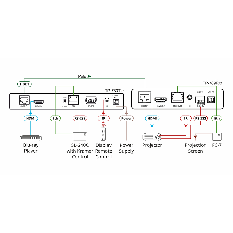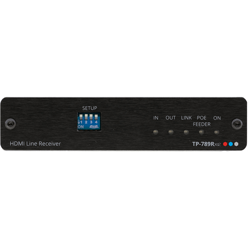 TP−789RXR to wysokowydajny, dalekosiężny odbiornik HDBaseT dla HDMI 4K60Hz (4:2:0), Ethernetu, RS−232 i sygnałów IR oraz 2-kierunkowego zasilania przez skrętkę. Rozszerza sygnały wideo do 100m (330ft) przez miedziane kable firmy Kramer przy rozdzielczości wideo 4K@60Hz (4:2:0) 24bpp i zapewnia jeszcze większy zasięg dla niższych rozdzielczości wideo HD. Ten odbiornik dostarcza moc przez kabel przedłużający miedziany do urządzenia akceptującego POE (Power over Ethernet), takiego jak ścienne gniazdo PoE, lub akceptuje PoE poprzez kabel przedłużający od zdalnego urządzenia dostarczającego PoE, co jest automatycznie wykrywane przez odbiornik.