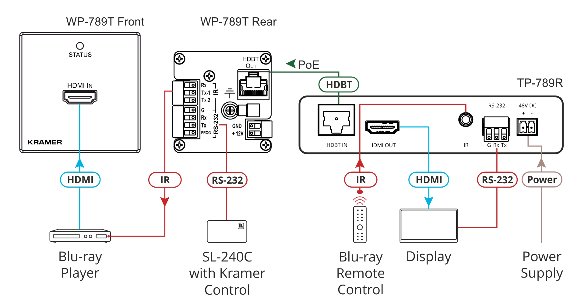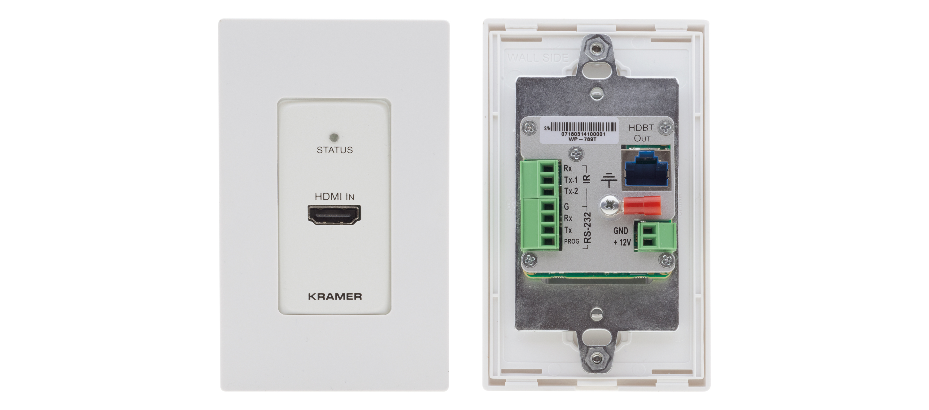 WP−789T to wysokowydajny, dalekosiężny nadajnik HDBaseT montowany na ścianie dla sygnałów HDMI 4K@60Hz (4:2:0) i HDCP 2.2 przesyłanych przez skrętkę. Konwertuje sygnał wejściowy HDMI na sygnał HDBaseT i przesyła go do kompatybilnego odbiornika. Rozszerza sygnały wideo do 40m (130ft) po kablu miedzianym Kramer przy rozdzielczości wideo 4K@60Hz (4:2:0) 24bpp i zapewnia jeszcze większy zasięg dla niższych rozdzielczości wideo HD. Ten nadajnik montowany na ścianie jest zasilany przez PoE (Power over Ethernet) poprzez kabel skrętkowy.