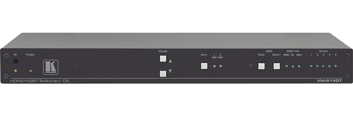 VM−214DT to wysokiej jakości dystrybutor HDBaseT o zasięgu przedłużonym 4K@60Hz (4:2:0), który przyjmuje sygnał wejściowy HDMI lub przedłużony sygnał wejściowy HDBaseT (do wyboru), wzmacnia i regeneruje sygnał oraz dystrybuuje go do czterech identycznych wyjść HDBaseT o przedłużonym zasięgu wraz z sygnałem sterowania Ethernet, RS−232 i IR. Urządzenie zawiera także wyjście pętli HDMI z funkcją de-embeddingu (ekstrakcji) audio do portu stereo analogowego. Jako zintegrowany dystrybutor ekstenderów, VM−214DT ponownie wysyła i dystrybuuje oryginalne sygnały HDBaseT o dalekim zasięgu z rozdzielczością wideo do 4K.