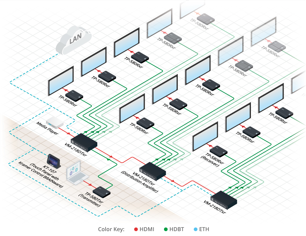 - Kable — W celu optymalizacji zasięgu i wydajności, używaj zalecanych kabli Kramer