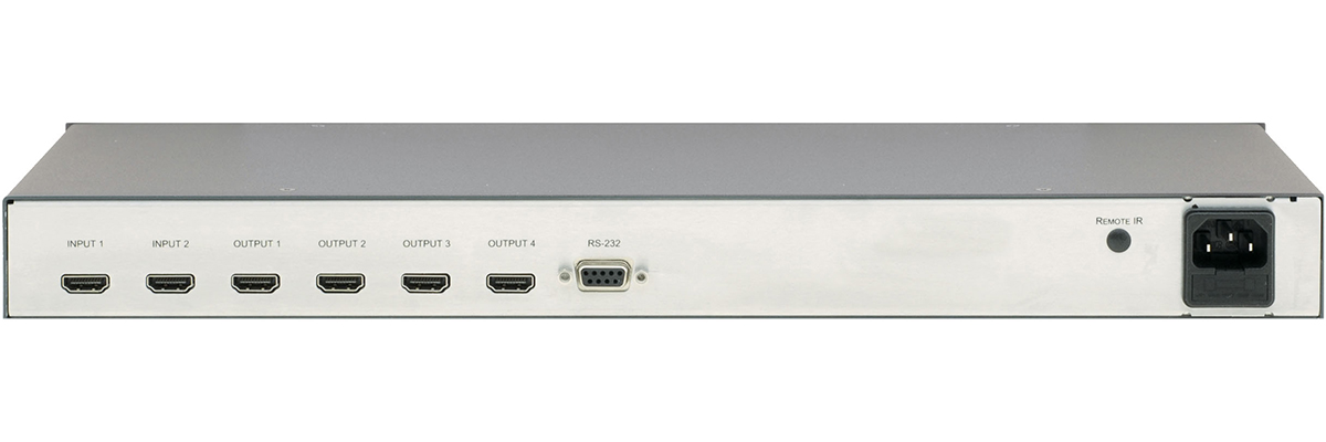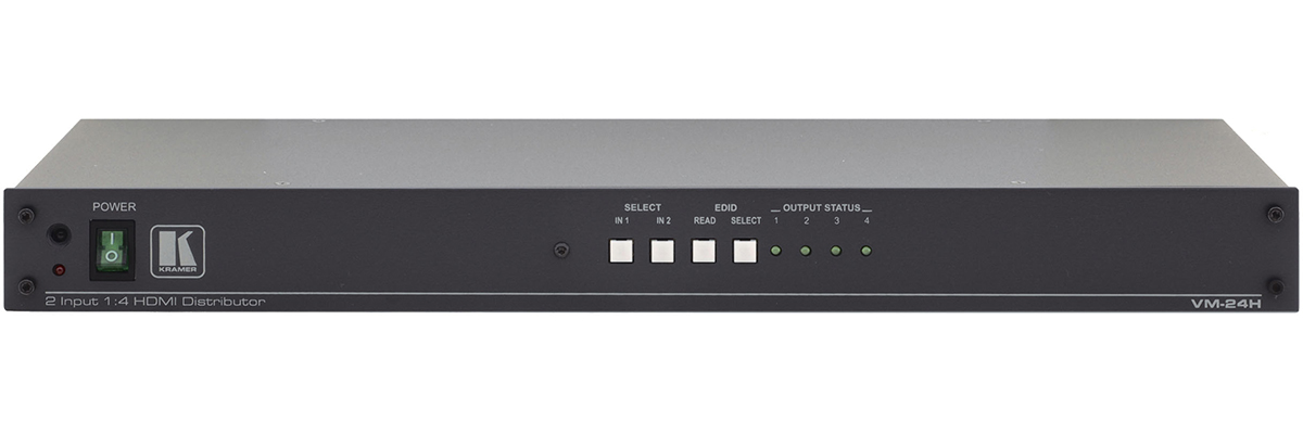 VM−24H to wzmacniacz dystrybucyjny dla sygnałów HDMI. Urządzenie regeneruje i wyrównuje jeden z dwóch wybieralnych sygnałów wejściowych i rozdziela go na cztery identyczne wyjścia.