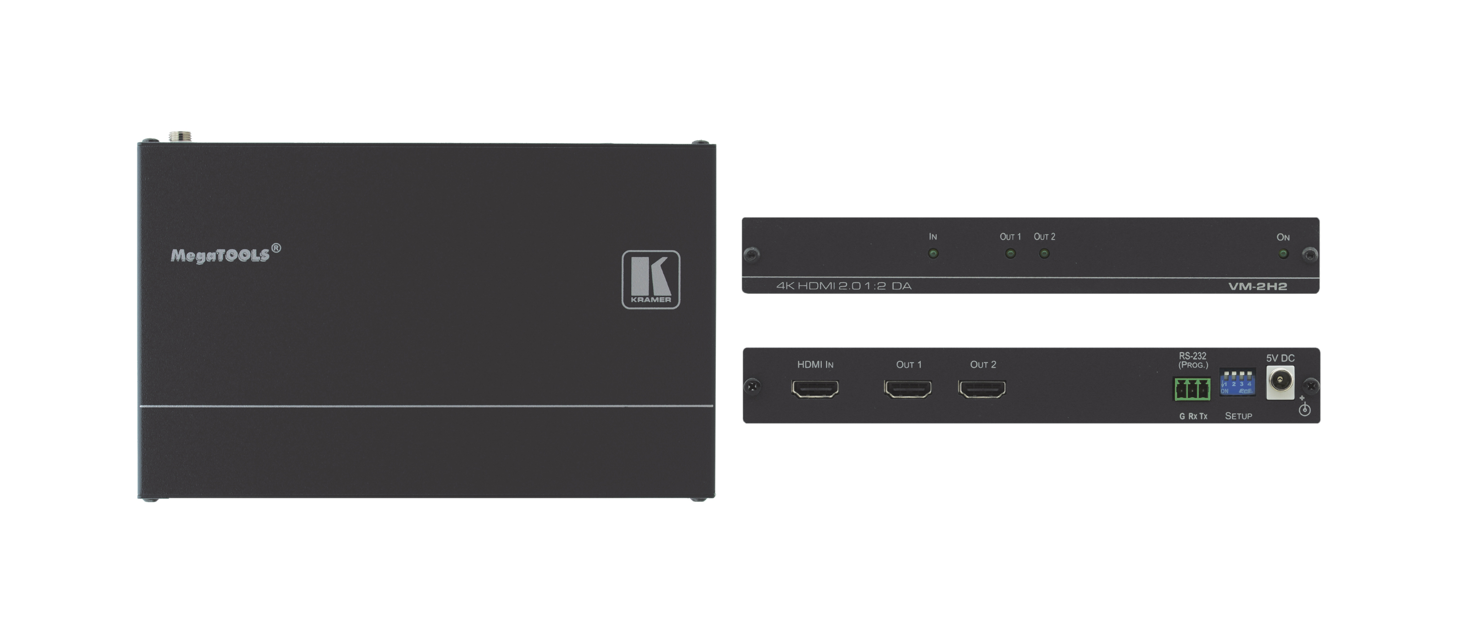 VM−2H2 to 1:2 wzmacniacz dystrybucyjny dla sygnałów HDMI 4K HDR zgodnych ze standardem ochrony treści HDCP 2.2. Urządzenie pobiera jeden sygnał HDMI, regeneruje i wyrównuje sygnał, a następnie rozdziela go na dwa identyczne wyjścia.