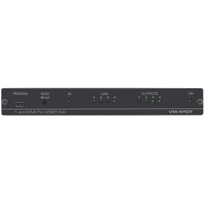 VM−4HDT to wysokiej jakości, dalekiego zasięgu dystrybutor rozszerzacza 4K@60Hz (4:2:0) HDBaseT, który pobiera jeden sygnał HDMI wraz z sygnałami sterowania IR i RS−232, konwertuje je na sygnał linii rozszerzenia HDBaseT i rozdziela go na cztery wyjścia HDBaseT łączące się z kompatybilnymi odbiornikami HDBaseT.
