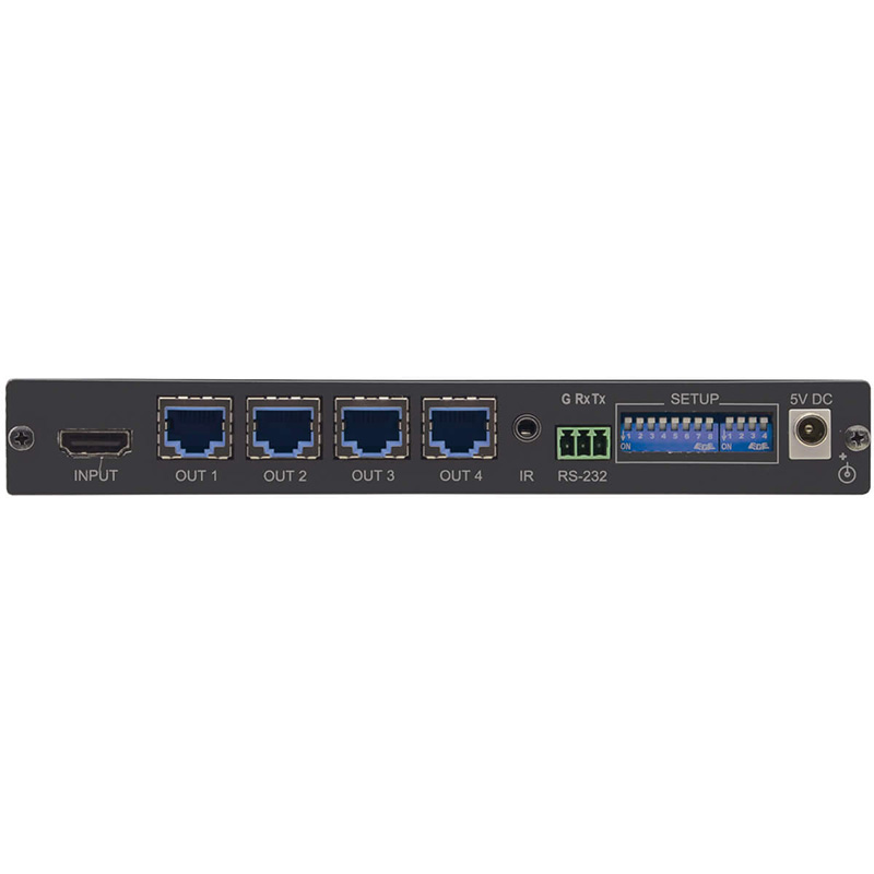 - Wysokowydajna dystrybucja — Rozdziela jeden sygnał HDMI na cztery długodystansowe wyjścia rozszerzenia HDBaseT z rozdzielczością wideo do 4K.