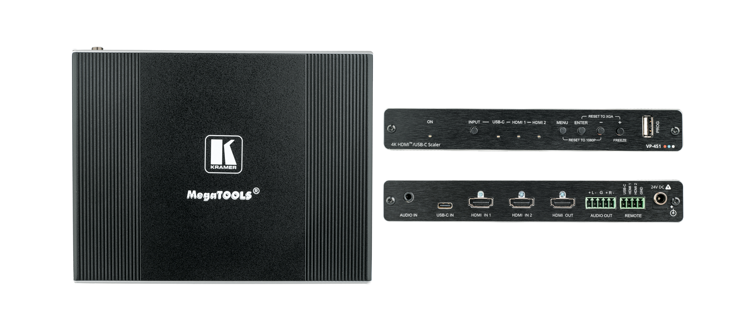 VP−451 to wysokowydajny 18G 4K cyfrowy skaler dla sygnałów HDMI i USB−C. Urządzenie skaluje w górę, w dół, i krzyżowo do rozdzielczości do 4K@60 (4:4:4). Rozdzielczość wyjściowa może być ustawiona tak, aby automatycznie podążać za natywną rozdzielczością odbiornika, lub ręcznie na własną niestandardową rozdzielczość.