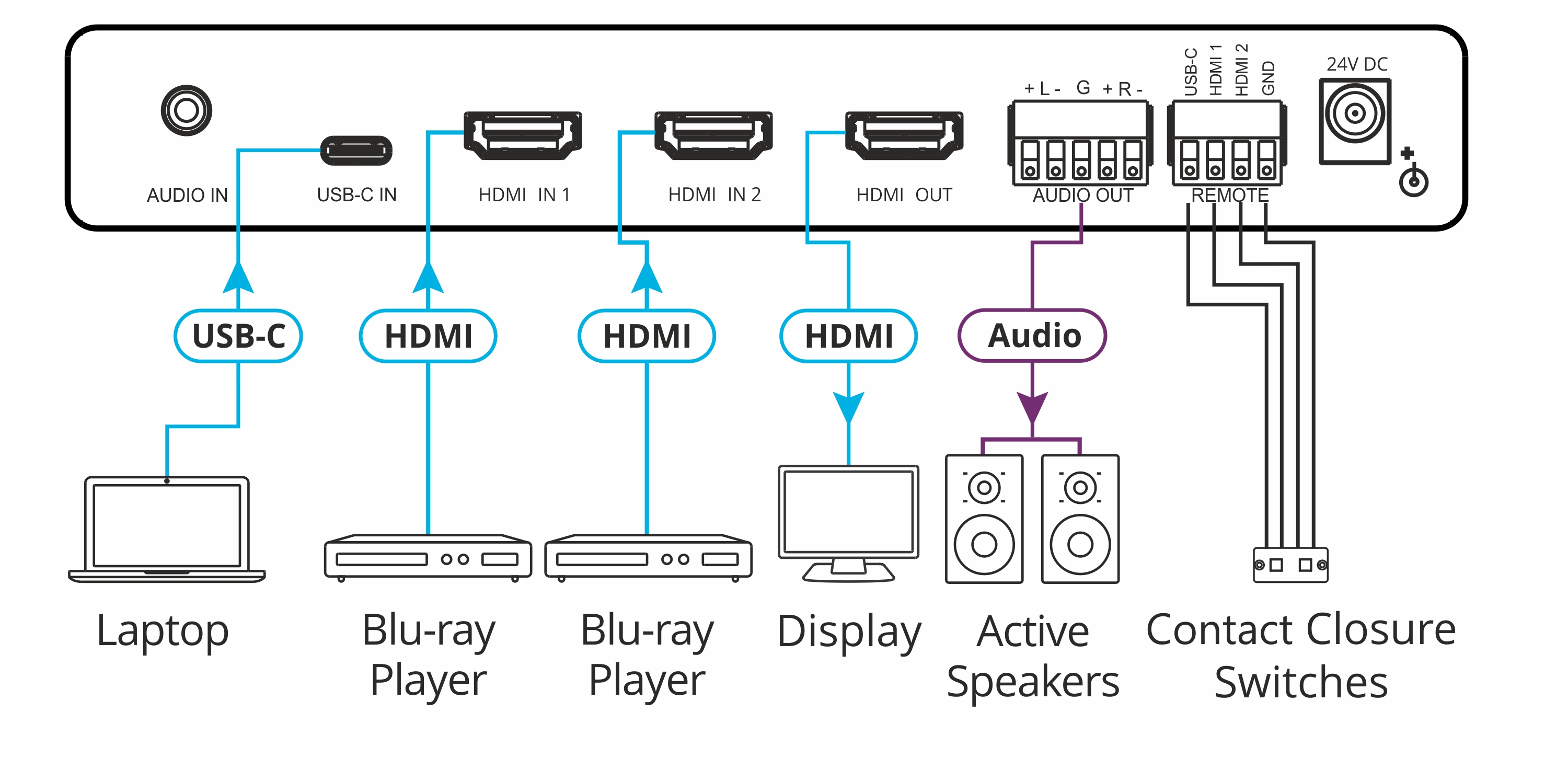 - Wysokowydajny profesjonalny skaler — obsługuje HDR10 i HDCP 2.2/1.4, i oferuje automatyczne przełączanie wejść, ciągłą synchronizację na wyjściu nawet jeśli sygnał wejściowy zostanie utracony lub przerwany, oraz wbudowany ProcAmp dla wygodnej regulacji sygnału.