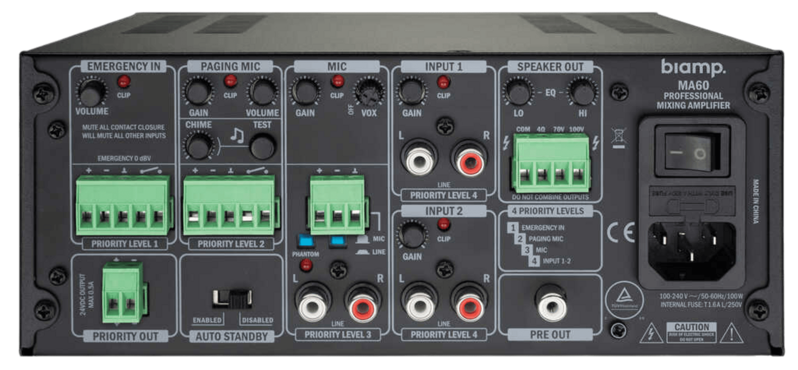 DESCRIPTION_PL: Kluczowe cechy: Intuicyjne panele przedni i tylny, Cztery poziomy priorytetów dla routingu audio, Cztery wejścia stereo, Dedykowane wejście alarmowe z wyłącznikiem wyciszenia, Wejście mikrofonu do komunikatów z kontaktronem i dzwonkiem, Bezobsługowa konstrukcja (bez wentylatora), 5-letnia gwarancja. Zapytaj o ofertę