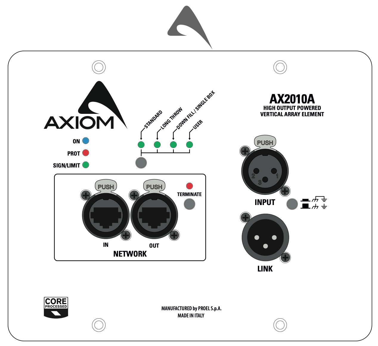 The AX2010A is a new powered line array element that combines superior sound quality with easiness and flexibility in a simple system with a very convenient price to-performance ratio. The AX2010A has been designed both for rental live sound applications and for fixed installations and has been engineered for the simplest use possible but without sacrificing anything in sound quality and performance.