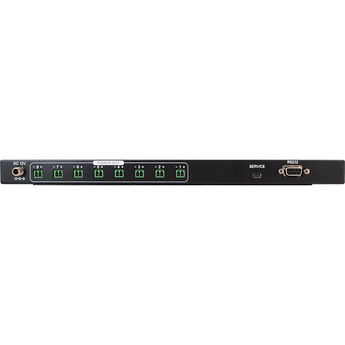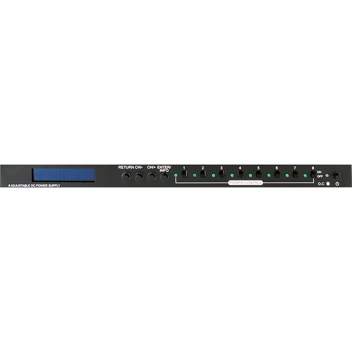 Regulowany zasilacz prądu stałego na 8 portów to splitter zasilania DC na 8 kierunków, który może dystrybuować energię elektryczną do 10.2Volt/3.2Amp na każdym porcie przy całkowitym zużyciu energii do 80 watów przez Terminal Block (3.5mm, 2 bieguny). Idealny do zastosowań profesjonalnych, urządzenie to zapewnia inteligentne sterowanie każdym indywidualnym portem, z obsługą regulacji napięcia oraz funkcji włączania i wyłączania, zarówno przez przyciski na panelu, jak i protokół RS-232. Jest również wyposażony w wyświetlacz OLED, który może pokazywać status wszystkich portów lub pojedynczego portu oddzielnie.