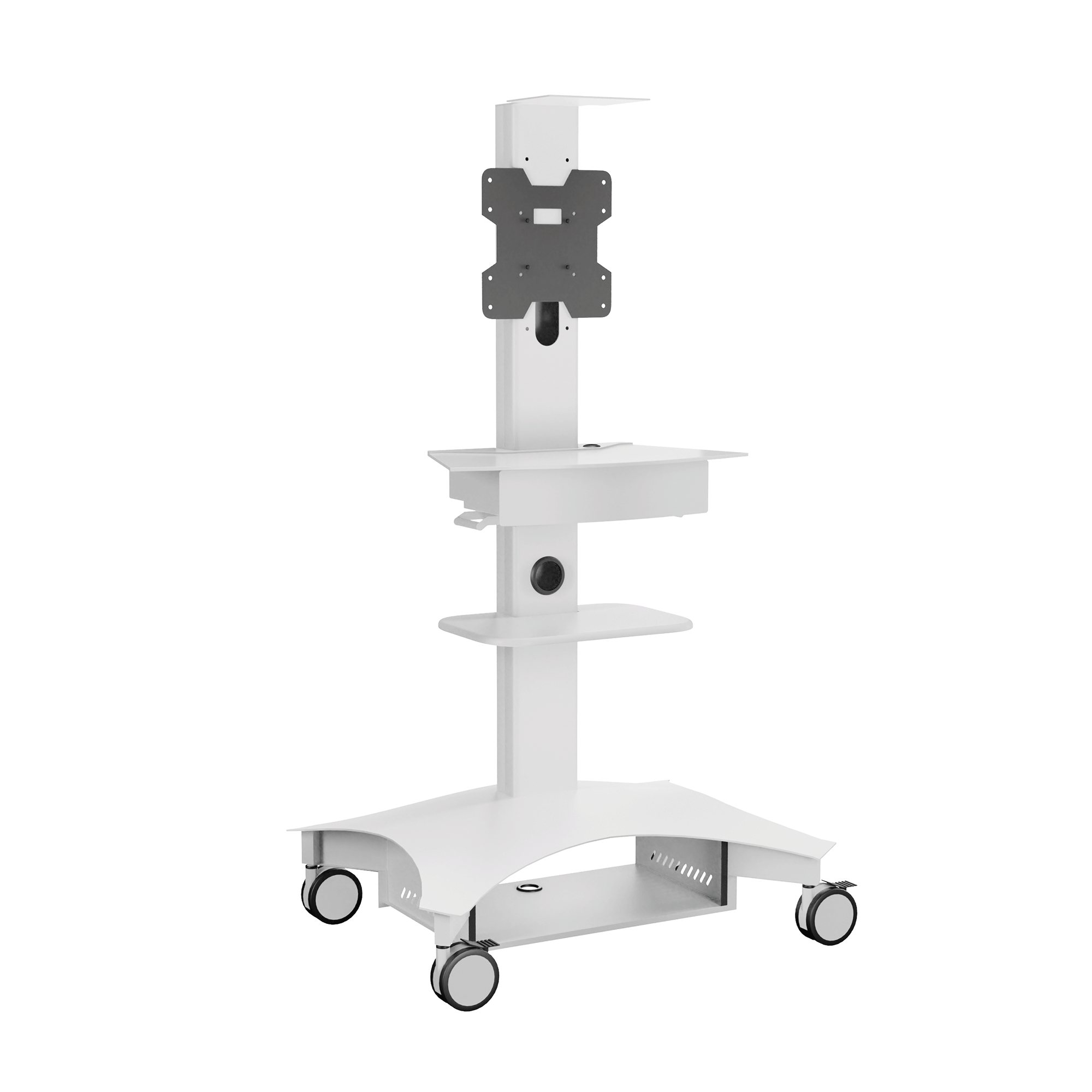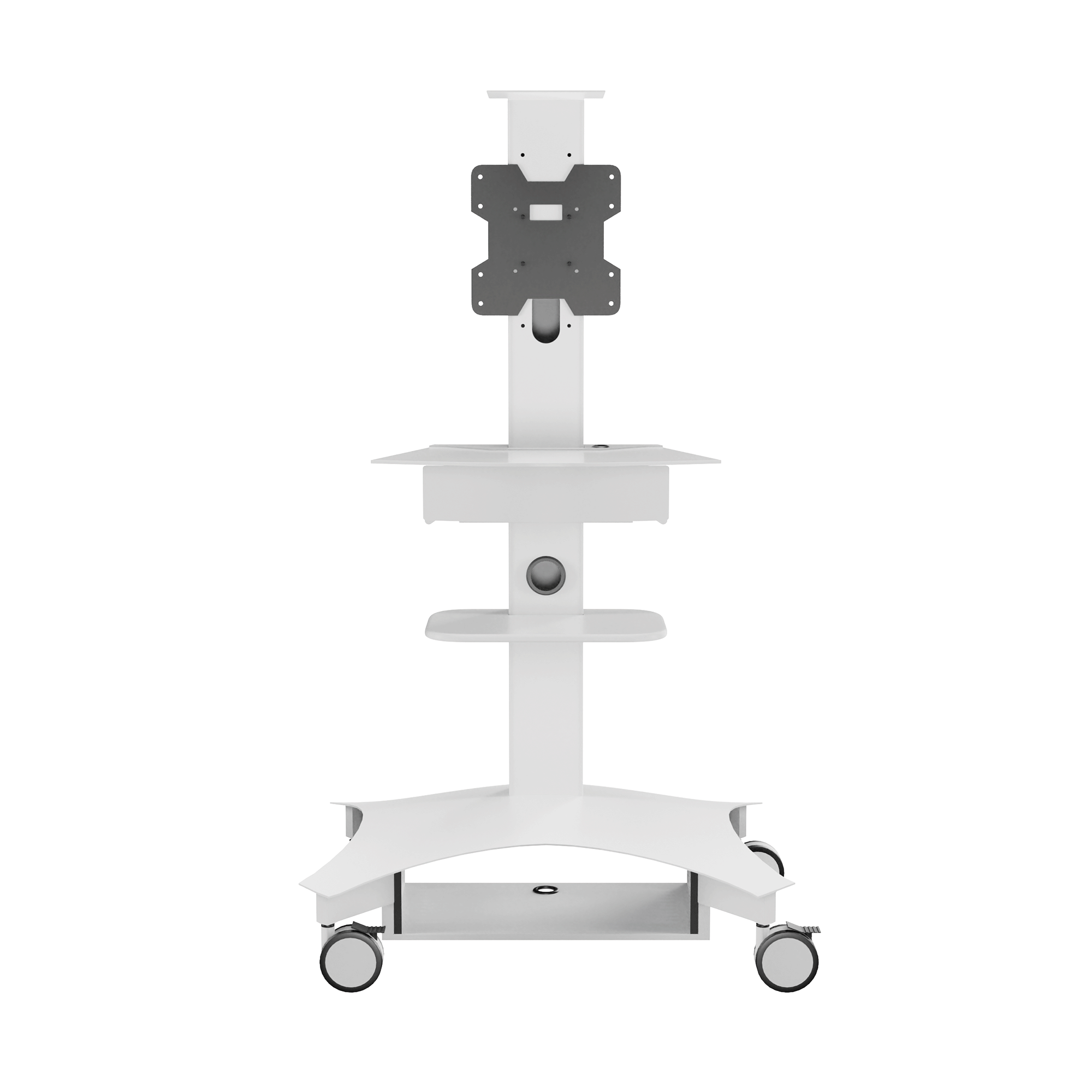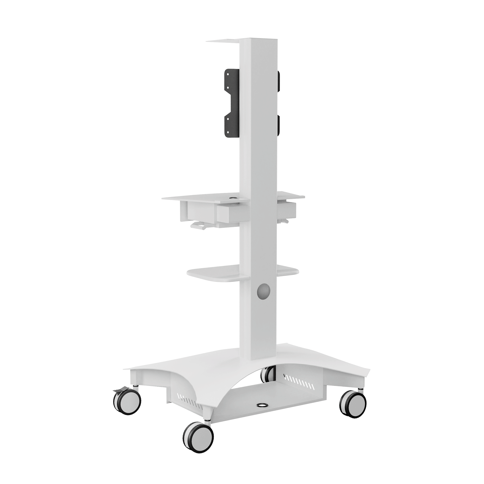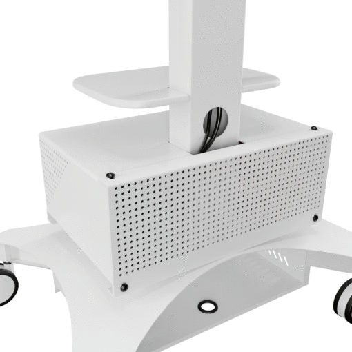 Lekki wózek telemedyczny TMP-200 zapewnia łatwość użytkowania i mobilność wymaganą do opieki nad pacjentem w placówce opieki zdrowotnej. Zmieniony model TMP-200 oferuje smukły profil i konstrukcję umożliwiającą przemieszczanie, co zapewnia mobilność potrzebną do poruszania się po korytarzach i między salami pacjentów. Wózek telemedyczny TMP-200 został zaprojektowany tak, aby integrować się z dzisiejszą technologią, oferując najlepsze doświadczenie dla dostawców i pacjentów. Duża powierzchnia robocza zapewnia wystarczająco dużo miejsca na klawiaturę lub potrzebny sprzęt medyczny. Duża wysuwana szuflada zapewnia szybki dostęp do potrzebnych materiałów. Ponadto wózek TMP-200 obsługuje pojedynczy wyświetlacz do 37″ lub podwójne wyświetlacze do 32″. Półka na kamerę wideo jest montowana nad wyświetlaczem, zapewniając możliwości telekonferencyjne. Obudowa akumulatora nie jest dołączona do wózka, ale może być zakupiona jako opcjonalne akcesorium. TMP-200 również obsługuje następujące rozwiązania Cisco Webex: Cisco Webex Desk Pro wraz z opcjonalnym uchwytem ściennym Desk Pro. Cisco Webex DX80 z uchwytem AVTEQ Webex DX80. Ponadto wózki telemedyczne AVTEQ są łatwe do czyszczenia przy użyciu najczęściej stosowanych w szpitalach, rozcieńczonych, nieścieralnych i nietoksycznych roztworów, w tym enzymatycznych środków czyszczących na bazie amoniaku, nadtlenku wodoru, środków wybielających lub alkoholu.